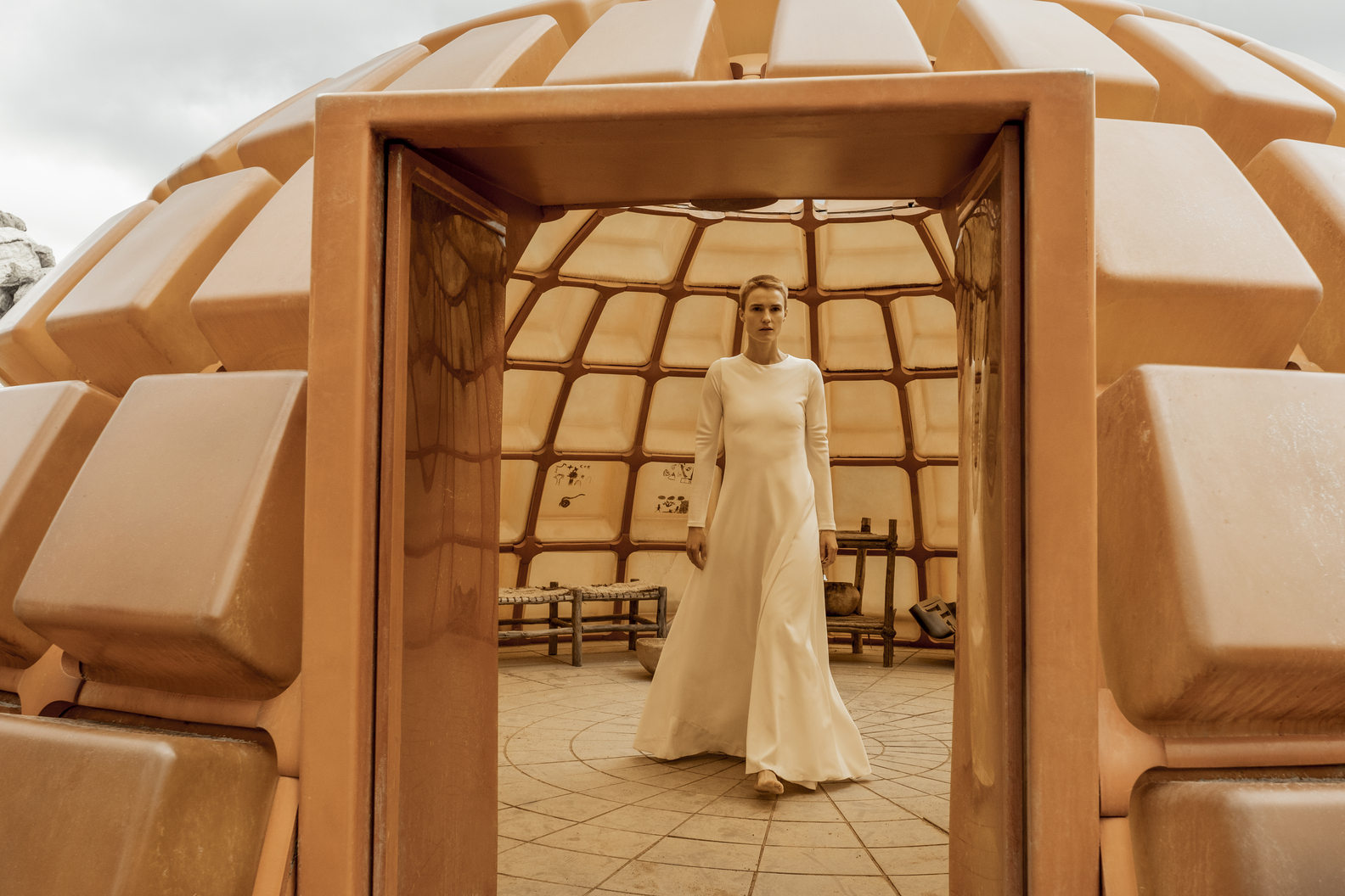 The Mithraic march through a sandy landscape populated with dunes, heading towards a large rock-like formation. The leader, Ambrose, is set down (to Marcus' reluctance). The elder becomes shocked to find a structure with an intelligently built design, having thought this to be a virgin planet. Another official declares it to have five points like in the prophecy. She utters that they will find the holy temple in the hidden land where Sol hid the answers to the Mithraic mysteries. A soldier exclaims that it is warm to the touch. The Mithraic touch the structure and kneel in respect, Marcus being the last one.